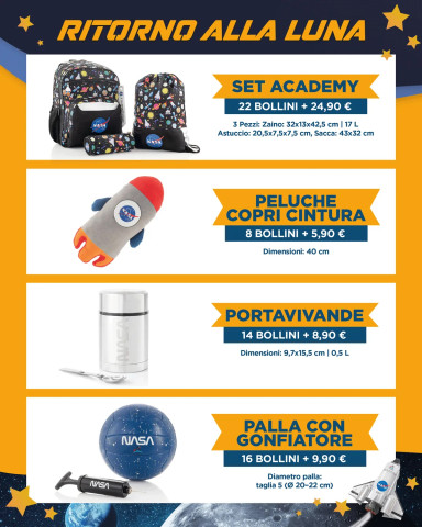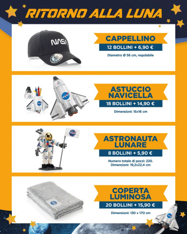 In tutti i SuperW, JuniorW e WStore ogni 15€ di spesa (scontrino unico, multipli inclusi) ricevi un bollino. Raccoglili sulla tessera e scegli il tuo premio ispirato al mondo dello spazio, da ritirare aggiungendo un piccolo contributo.